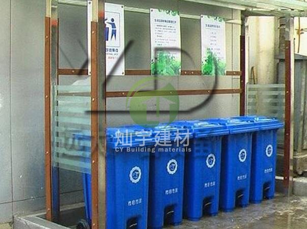 垃圾分类亭顶部的顶棚材质包括不锈钢、pc耐力板、阳光板、钢化玻璃等,仿古款式的垃圾亭顶部仿古瓦的材质包括聚丙烯树脂,玻璃钢,通过玻璃纤维布加树脂制作而成,具有重量轻、单块面积大等易于安装等特点。